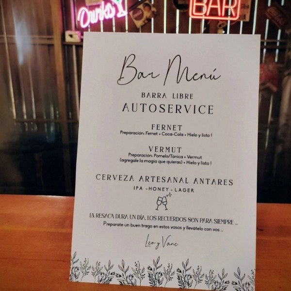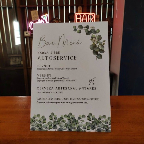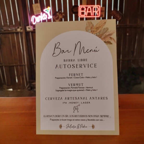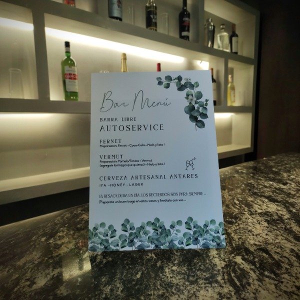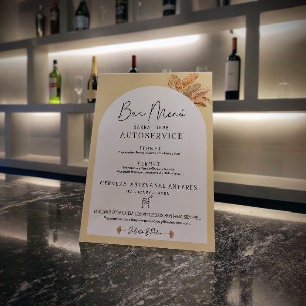 Convertí tu barra de bebidas en una experiencia divertida e interactiva. Adaptamos el contenido a las bebidas específicas de tu evento (Ron, Gin Tonic, Aperitivos, etc.). Impreso en papel opalina liso montado dobre un soporte rigido, listo para ser colocado sobre la barra.