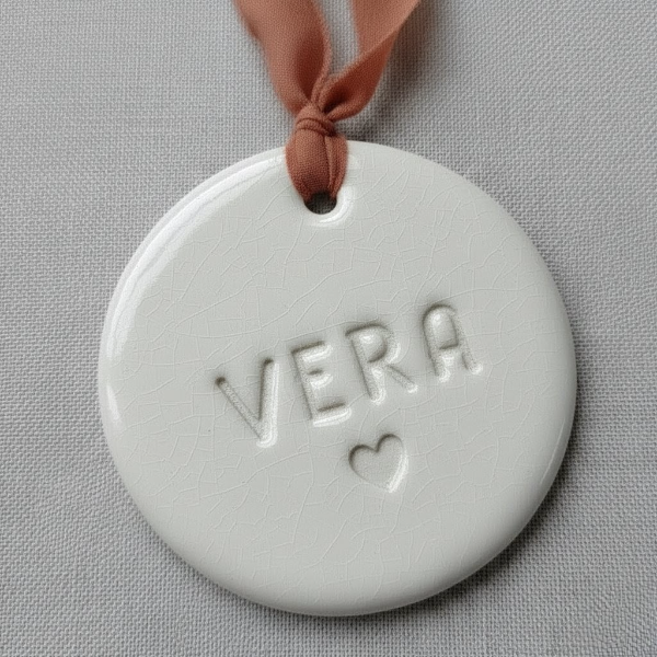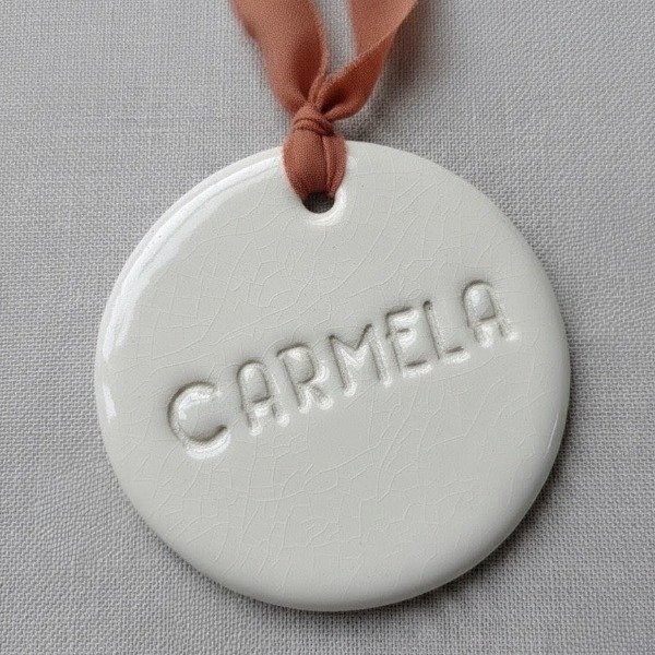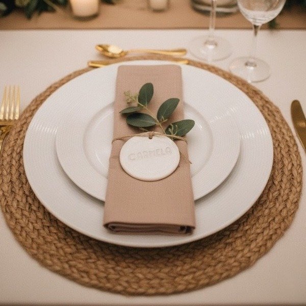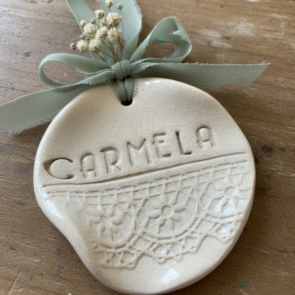 Cada pieza es única, hecha y esmaltada a mano. Elige un nombre, iniciales o una palabra especial que quedará grabada en bajo relieve con una tipografía elegante y atemporal. Podemos agregar la fecha del evento/unión. Disponible en un diseño liso o con un detalle de encaje en relieve en la parte inferior, ideal para bodas de estilo rústico, boho o clásico. Se complementan con una delicada cinta en color a elección para colgar y la opción de incluir un pequeño ramillete de flores secas, añadiendo un toque natural y sofisticado. Un recuerdo duradero y útil que tus seres queridos conservarán con cariño. Utilízalas como etiquetas colgantes personalizadas para indicar el lugar de cada invitado en la mesa.