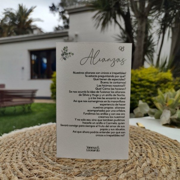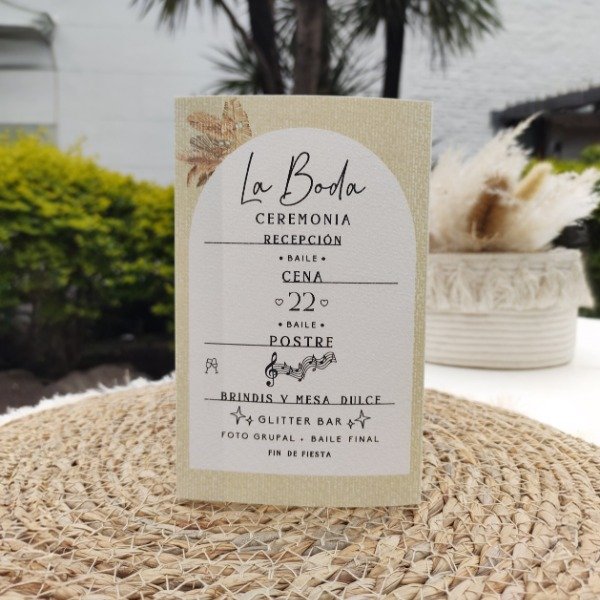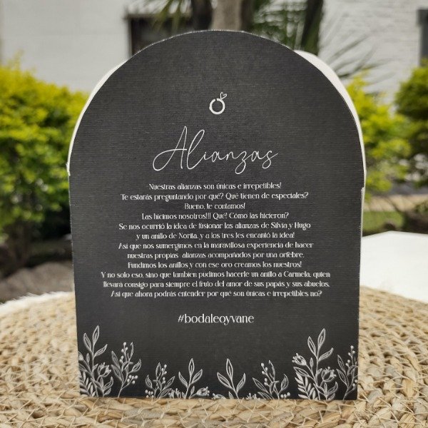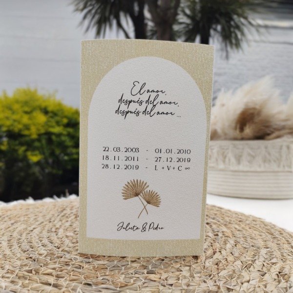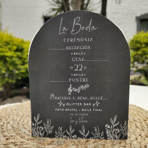 Tríptico para complementar la deco de las mesas. Personalizable con el texto, detalles del menú, historia de los novios, cronograma de fiesta, etc. Impreso en papel opalina liso alta calidad.