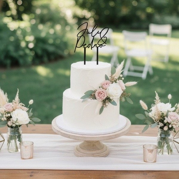 Topper de torta personalizado perfecto para bodas, aniversarios, compromisos o cualquier festejo. Es un artículo hecho a medida fabricado en acrílico de alta calidad (disponible en color negro como el de la imagen, o en opciones espejo como dorado, plateado o rosa gold) que proporciona una apariencia moderna, nítida y sofisticada.