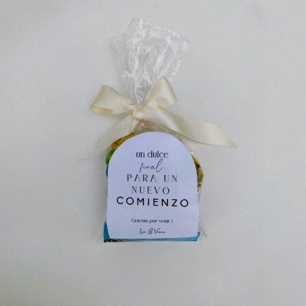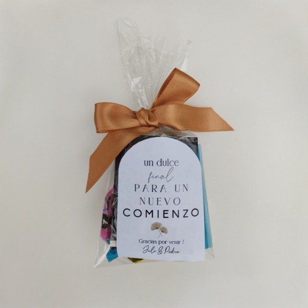 Ofrece a tus invitados una dulce despedida . Este detalle es la manera perfecta de agradecer su presencia y simbolizar el inicio de una nueva etapa. Ideal para bodas, cumpleaños o cualquier celebración especial. Etiqueta frontal personalizada y lazo color a eleccción. Incluye: 1 Bon o Bon 1 Gomitas 1 Pico Dulce 1 Tableta de Chicles 6 Caramelos