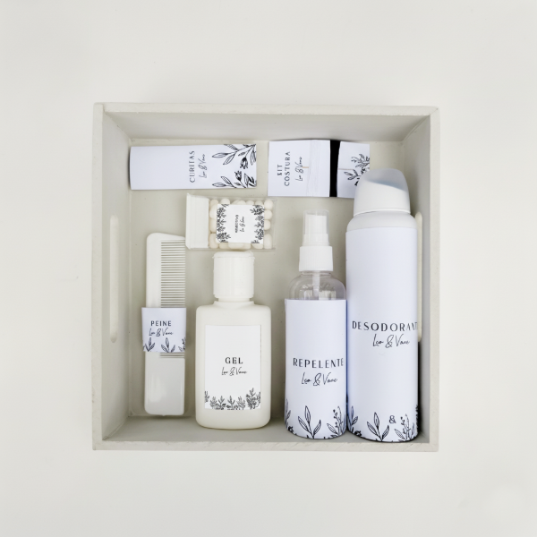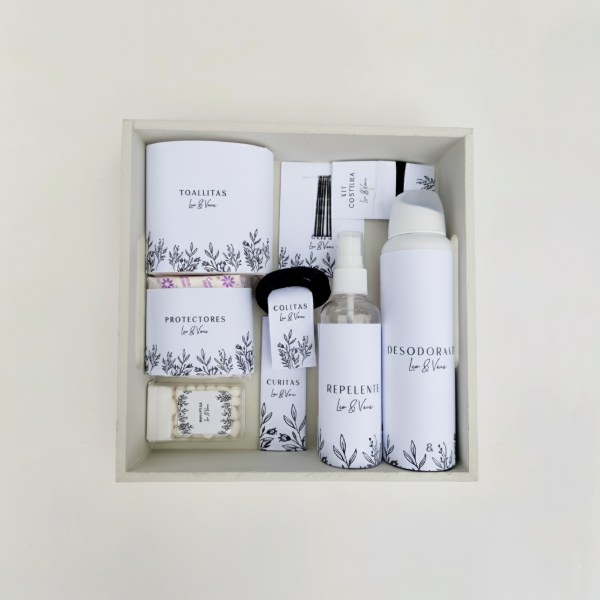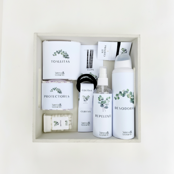 Contiene: Bandeja con 4 toallitas femeninas, 4 protectores diarios, 1 desodorante, 1 repelente para mosquitos, 1 kit de costura, 6 colitas de pelo, 12 clips, 6 curitas y 1 cajita de tic-tac/mentitas.
