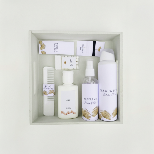 Contiene: Bandeja con 1 desodorante, 1 repelente para mosquitos, 1 kit de costura, 1 gel para pelo, 6 curitas, 1 peine y 1 cajita de tic-tac/mentitas