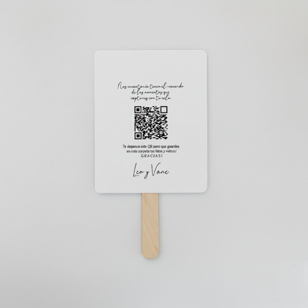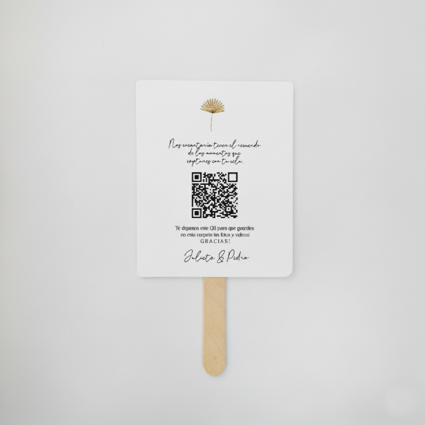 Estos abanicos de paleta son un detalle imprescindible y multifuncional para cualquier boda, especialmente para ceremonias al aire libre o en climas cálidos. Función del Código QR: Invita a tus amigos y familiares a subir todas las fotos y videos que tomen con sus celulares a una carpeta compartida (ej. Google Drive, Dropbox, etc.), asegurando que no se pierda ningún momento capturado desde su perspectiva. Materiales: Impresión de alta calidad sobre Papel Opalina Lisa o Papel Texturado Premium, con esquinas redondeadas, montado sobre un palito de madera resistente (tipo paleta) para un agarre cómodo.