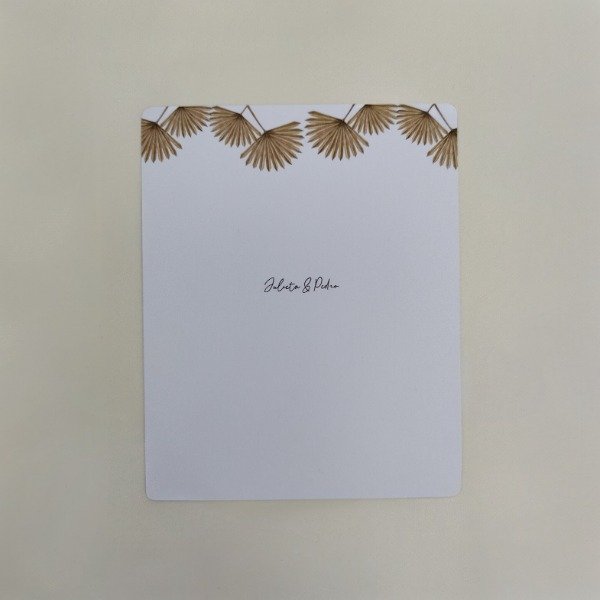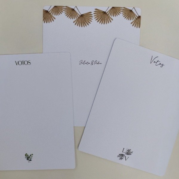 Diseñadas para ser un recuerdo atesorado, estas tarjetas son el lugar perfecto para escribir las palabras que sellarán tu compromiso, haciendo del momento de la ceremonia algo aún más íntimo y personal. Cada set incluye dos tarjetas pensadas para la pareja, con espacio en blanco para escribir a mano sus votos. Impresas en papel opalina lisa de alta calidad con un acabado mate, ideales para escribir con cualquier tipo de bolígrafo y que perduren como un recuerdo valioso.