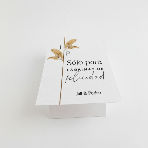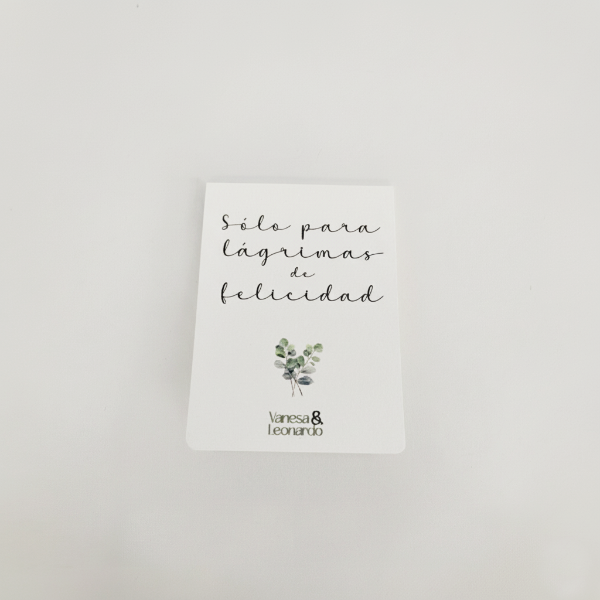Preparate para los momentos más emotivos de tu ceremonia, un detalle tierno para vos y para tus invitados. Cada kit incluye una delicada funda de papel con la tarjeta frontal personalizada y un pañuelo de papel blanco cuidadosamente doblado en su interior.
