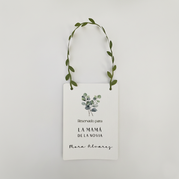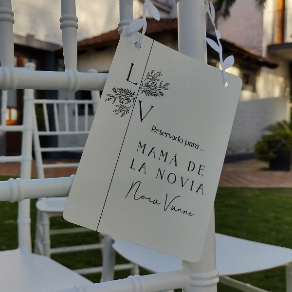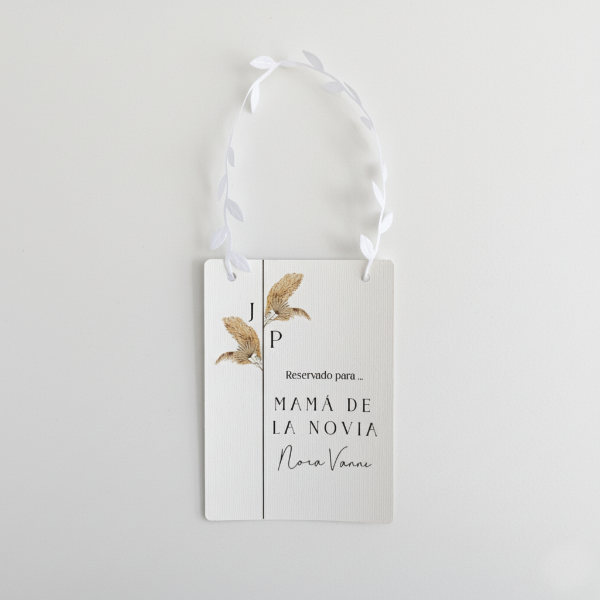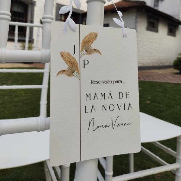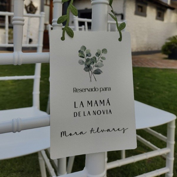 Asegura un lugar especial para tus familiares y seres queridos. Ideal para reservar los asientos de honor (padres, abuelos, padrinos) en la primera fila durante la ceremonia. El cartel viene perforado en la parte superior, listo para colgar de la silla con cinta. Impresión de alta calidad sobre Opalina Lisa o Papel Texturado Premium que asegura que el cartel se mantenga liso y visible.